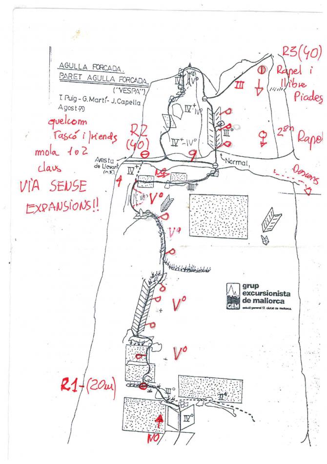 Via Clàsica que recorre la cara sud de s´agulla forcada..sa vía comença per un diedret a sa dreta d´un de ben gros Fins un arbre on fem la 1ª reunió.D´aquí es surt per una fisura ben dreta,al cap d´uns 3 mts trobarem un pitó i cap amuntuna mica mes ,despres un diedret una mica a s´esquerra i despres un tram disfruton amb algún pas de bavaresa.Trobem un pitó i fem un flanqueig delicat cap a s´esquerra i recte amunt fins una gran plataforma,on hem de muntar la reunió,dons no hi ha res.(hi havía una de parabolts i la van llevar,suposo que per conservar l´esperit auténtic de la vía. D´aquí es pot seguir recte amunt o anar a cercar sa normal (3º),lo me llógic.Ademes no duiem massa material.