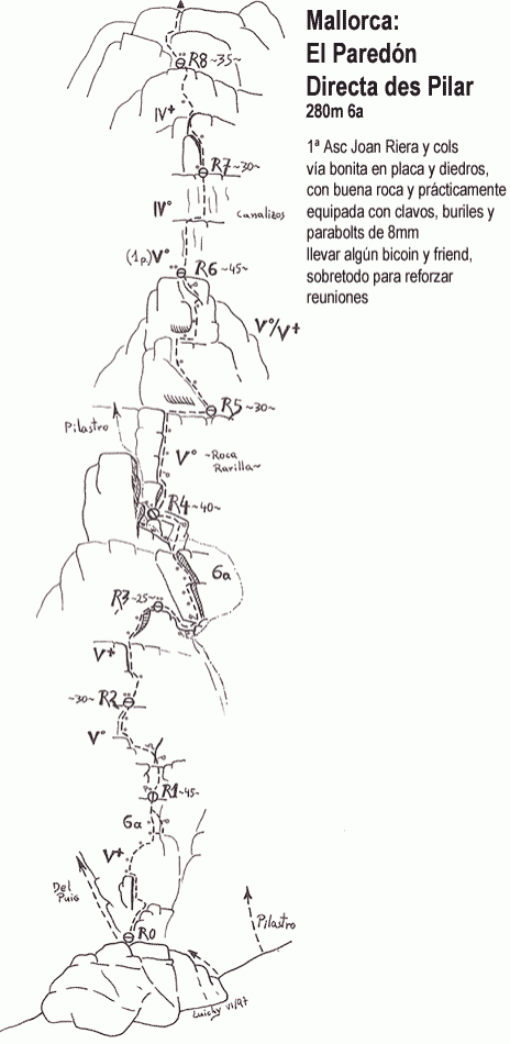 Via ya comentada en esta pàgina,pero adjunto la reseña de Luichy por estar muy bien y detallada.el último largo no es el que se indica,ya que se cayó por un desprendimiento visible desde abajo.Desde la útima R veremos una chapa,NO hay que ir a buscarla,se va recto unos 3 m. a la drecha de esta chapa a buscar una llastrita.Es 5º,5+ a protejer con tascones de cable y aliens.Una vez superado este tramo,ya en lo facil si flanqueamos a la derecha veremos 2 spits del antiguo último largo.Nosotros montamos la R con friends. Material: Aliens del azul al rojo y camalots del 0,75 al 3,tascones de cable ,algun cordino para puentes o merlets y cintas largas,sobretodo las de reunión ya que hay que reforzarlas.El material fijo está todo en buen estadop.Vía imprescindible,mantenida,dificil pero no expuesta,ideal para ir introduciéndose en la escalada clàsica pues es casi imposible embarcarse