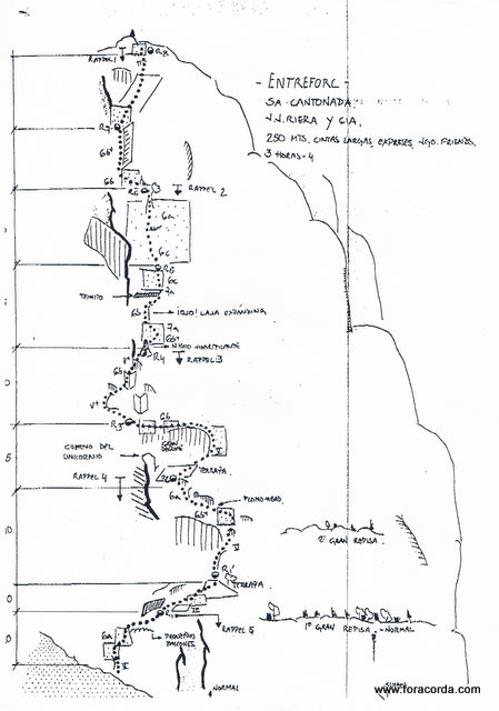 Esta vía recorre toda la arista izquierda de la grán placa de S´Entreforc, haciendo travesías sobre enormes techos, impresionante!!.