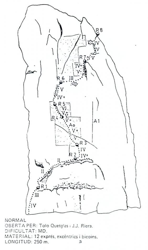 Suena raro que un viote tan vertical tenga este nombre,pero así es.Una viote vertical,algo reequipado,roca excelente y un payio que te absorbe. 1º largo.IV-paset de Vº anant a trobar un buril sense xapa una mica as s´esquerra en un esperonet,flanqueix a sa dreta a buscar un arbre.IV-IIIª 2ºn llatg:Pujam pel diedre,IVi quan es posa dret tombam a s´esquerra pfins una gran repisa,IIIper pujar per terreny fàci fins a trobar la repisa (selvàtic-IV) fins a sa reunió.Per es caní trobam un munt d´instalacions de ràpel.Sa nostra es sa penúltima.La següent ja es la des suïsos. Ojo,sa tirada deu tenir uns 50 m. 3º LLARG;bRURAL!!! PASSEMper una coveta xulísima.Foto!! 4º: Llarg.LLiure,V,V+.A1e.Ses xapes recuperables estàn posades,no les leveu!!!!.Hi ha parabolts cada 2-3 burils. 5º: Llarg:pot empalmarse perfectament am s´anterior.V+,VIa.Trbam 2 parabls i un clau.Reunió en un nicho amb bastanta ferralla i 2 parabolts de 10. 6º: Llarg.Brutal!!!: sortim selvàticanent a s´esquerra a buscar una fisura fantàstica.V-V+-V.1 clau,2 bongs i un merlet. 7º: llarg.Sortim cap a sa dreta a buscar un diedre guarreindogo amb un tac de fusta a sa fisura ,V+. No vaig fer s´últim llarg.Anava en solitari i es dia era curt,hi els rapels per sa via des suïssos.Ojo,n´Hi ha un de 40 mts.,i jo amb un 70... Sescens per sa via des suïsos Superrecomenable Material: Joc de tascons,excentrics del 6 al 9,joc de friends fins el 2,bagues llargues,cordinos